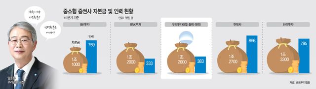 10년 만에 임 회장식 증권 M&A가 시작됐다. 오는 8월 우리종합금융과 한국포스증권의 합병증권사로 '우리투자증권'이 출범한다. 10년 전 농협금융이 인수했던 NH투자증권은 현재 자기자본 규모가 7조원이 넘는, 업계 3위의 대형사로 성장해 있다. 이번에 출범하는 우리투자증권의 자본규모는 1조2000억원 수준으로 업계 18위 수준이다. 우리금융은 10년 만에 증권업 진출이라는 숙원 사업을 이루긴 했지만, 사실상 팔 다리가 없는 상황이다. WM(자산관리)나 IB 등의 업무를 위해선 자본확충이 필요한 상황이기 때문이다. 오프라인 점포도 4곳에 불과하다. 양사의 통합앱과 우리금융그룹의 앱을 접목시켜 증권고객 확보를 위해선 디지털 인력도 필요하다. 임 회장이 증권사 출범을 앞두고 미래에셋증권 출신 인력을 대거 확보하고 있는 배경이다.