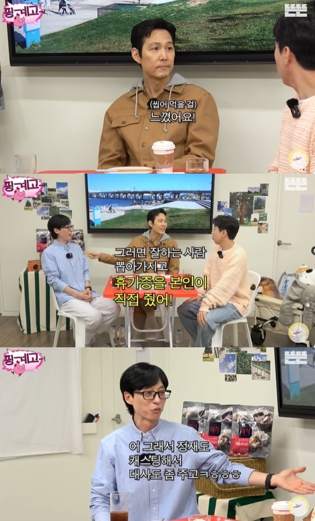 이정재는 "제일 중요한 건, 맨 마지막에 다 끝나면 잘하는 사람을 뽑아서 휴가증을 유재석이 직접 줬다. 대단한 권력자였다"고 떠올려 웃음을 자아냈다.