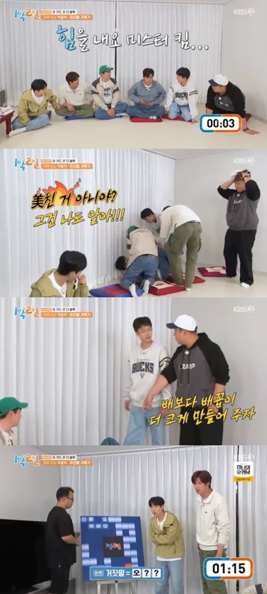 연정훈은 김종민이 틀리면서 실패하자 "미친 거 아니냐? 이건 나도 안다"고 했다. 김종민은 "앞에서 시간을 잡아 먹었다"고 변명을 했다.