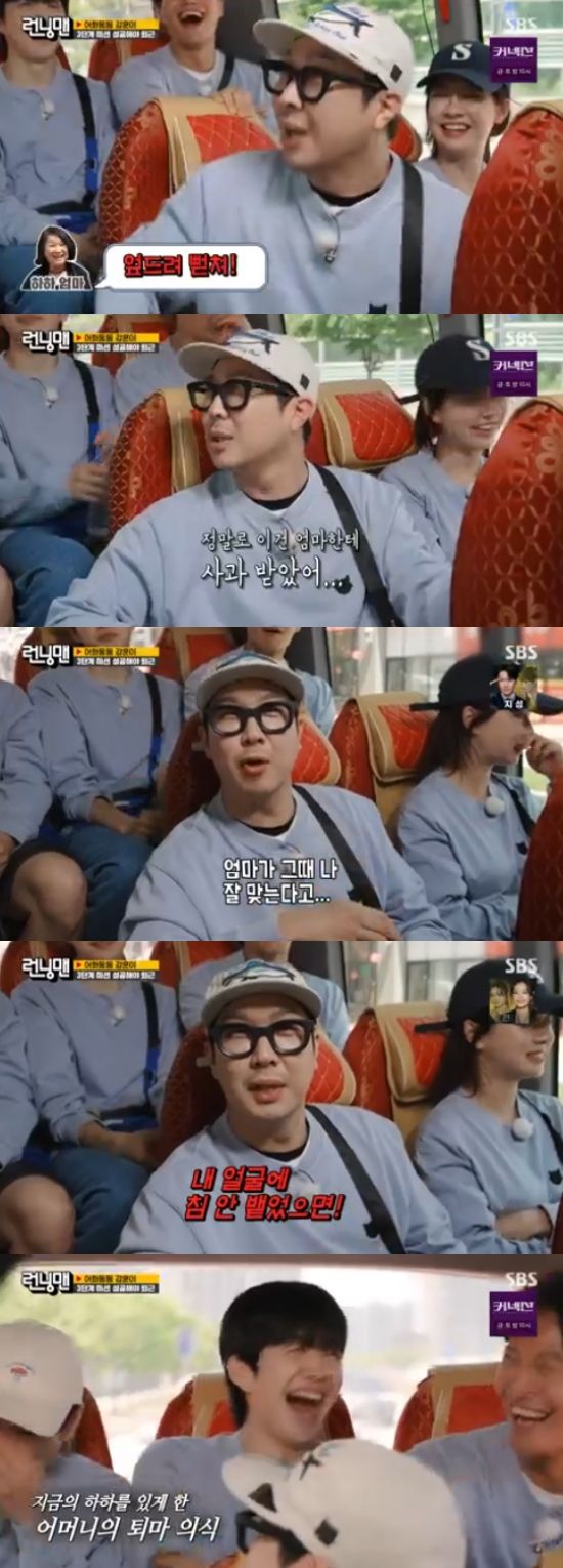 이를 들은 하하는 "우리 엄마는 내가 자는데 깨워서 때린 적도 있다. 나는 그게 제일 상처였다. 자는데 깨워서 '엎드려 뻗쳐'를 시키셨었다. 이건 내가 엄마한테 30년만에 사과를 받았던 부분"이라고 말해 웃음을 줬다.