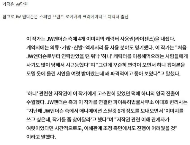 먼저 달려라 하니의 원작자인 이진주 작가에게 JW앤더슨에게서 연락옴, 다행히 저작권을 모두 이진주 작가가 가지고 있었음