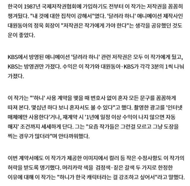 이진주 작가는 이전부터 저작권을 꼼꼼히 챙김, 하니 애니메이션 제작사 회장도 저작권이 작가에게 가야 한다고 생각한 결과,