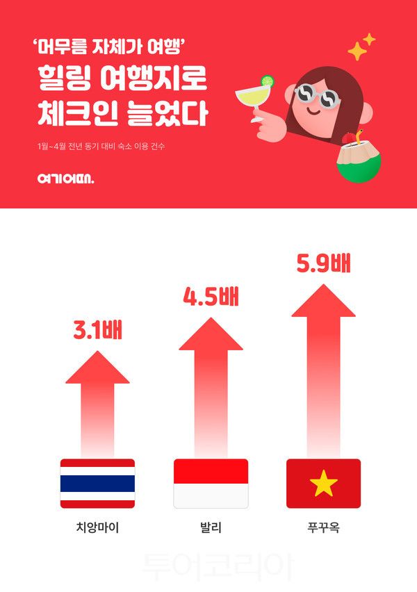 여기기어때가 해외 도시별 데이터를 분석한 결과, 올해 1월부터 지난 4월까지의 ‘치앙마이’, ‘발리’, ‘푸꾸옥’의 숙소 체크인 데이터가 전년 동기간 대비 각각 3.1배, 4.5배, 5.9배 이상 증가했다.