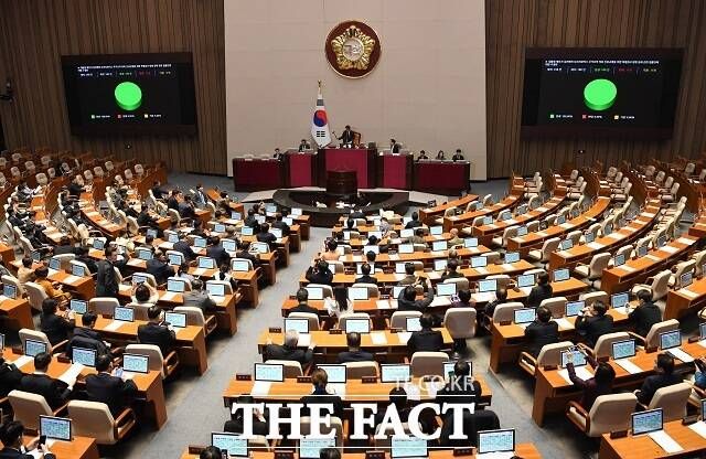 지난해 12월 28일 국회 본회의에서 대통령 배우자 김건희의 도이치모터스 주가조작 의혹 진상규명을 위한 특별검사 임명 등에 관한 법률안이 가결되는 모습. 여당의 불참 속에 야당 주도로 통과됐다. 이처럼 21대 국회에서 여야는 쟁점 법안을 두고 강하게 충돌해 왔다. /남용희 기자