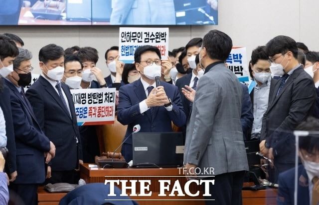 2022년 4월 27일 새벽 국회 법제사법위원회에서 검수완박법으로 불리는 검찰청법·형사소송법 개정안이 가결된 이후 언쟁을 벌이는 여야 의원들. /국회사진취재단