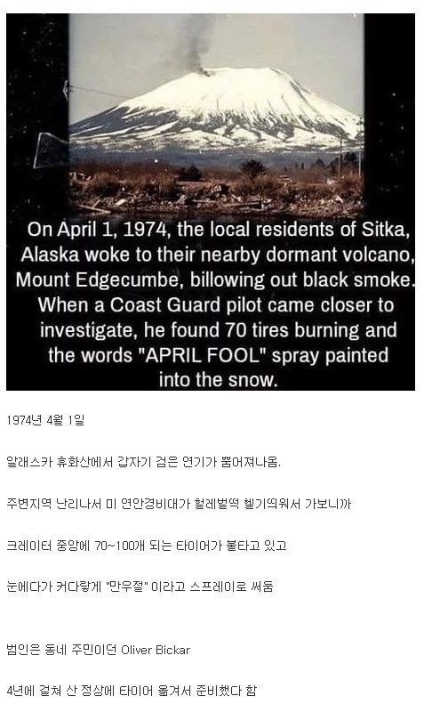 1974년4월1일.알래스카의싯카(Sitka)라는작은도시에있던해발976m의에지컴브(Edgecumbe)산에서연기가피어오르기시작했다.주민들은깜짝놀라거리로쏟아져나왔다.지방당국으로전화문의가쇄도하자주노(Juneau)에있는해안경비대사령관은해군제독에게보고했고,해군은자세한조사를위해헬기를띄워서헬기는연기가나는산꼭대기로접근했다.