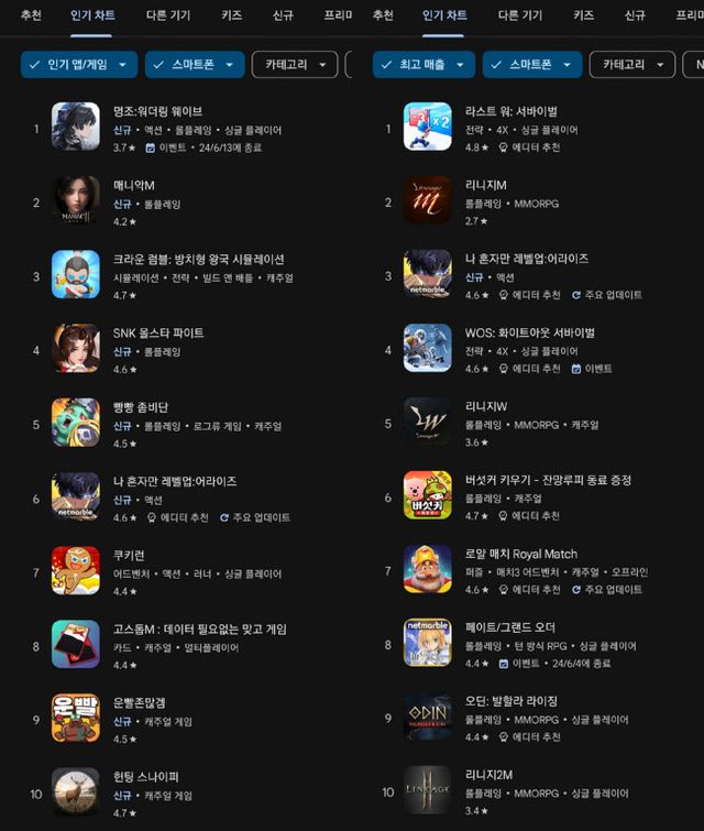 쿠로게임즈가 '명조: 워더링 웨이브'(이하 명조) 5월 23일 정식 출시, 구글플레이 인기 순위 정상을 차지했다.