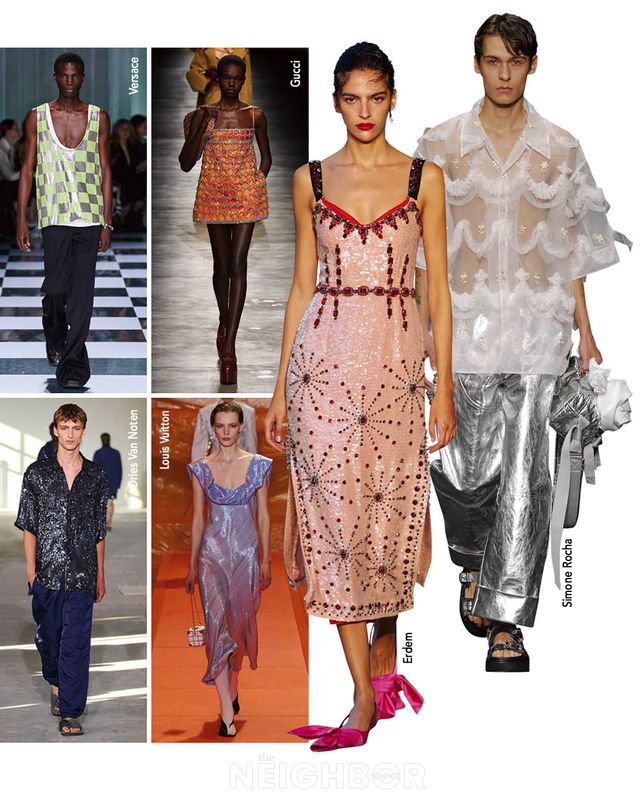 휴양지에서 둘만의 특별한 디너를 계획하고 있다면 화려한 이브닝 웨어는 필수로 준비하자. 시퀸이나 크리스털 디테일, 메탈릭한 소재가 조명 아래 반짝이며 두 사람을 주인공으로 만들어줄 것이다. 단, 화려함에도 강약 조절이 필요하다. 시몬 로샤는 강렬한 메탈릭 팬츠에 귀여운 리본 장식을 더한 시스루 셔츠로 분위기를 가볍게 환기시켰고, 베르사체와 드리스 반 노튼은 화려한 톱에 미니멀한 팬츠를 매치했다. 루이 비통처럼 시퀸 소재의 이브닝드레스를 입을 때는 액세서리는 배제하고 심플한 슈즈를 매치해 룩의 밸런스를 맞춘다.