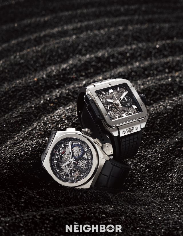Zenith 지름 44mm 케이스에 셀프와인딩 칼리버 엘 프리메로 9004 무브먼트를 탑재한 데피 엘 프리메로 21 블랙 1967만원. Hublot 42mm 티타늄 케이스에 스켈레톤 가공한 셀프와인딩 크로노그래프 무브먼트를 장착한 스퀘어뱅 유니코 티타늄 3000만원대.