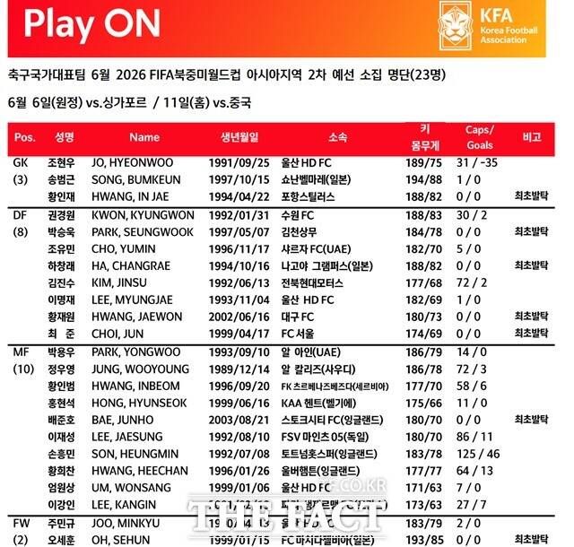 대한축구협회(KFA)는 2026 FIFA(국제축구연맹) 북중미 월드컵 아시아지역 2차 예선 C조 두 경기에 나설 6월 A대표팀 선수 소집 명단(23명)을 27일 발표했다.