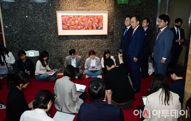아시아투데이 이병화 기자 = 추경호 국민의힘 원내대표와 박찬대 더불어민주당 원내대표가 27일 국회의장실에서 김진표 국회의장 주재 여야 원내대표 회동을 마친 뒤 의장실을 나서며 취재진의 질문에 답하고 있다.