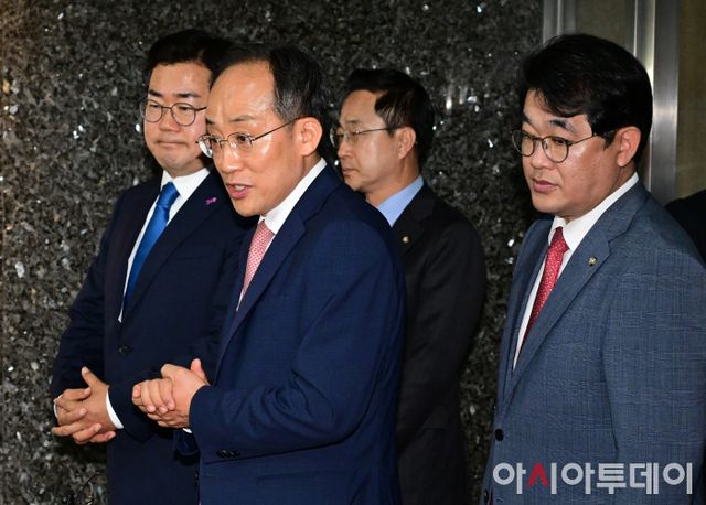 아시아투데이 이병화 기자 = 추경호 국민의힘 원내대표와 박찬대 더불어민주당 원내대표가 27일 국회의장실에서 김진표 국회의장 주재 여야 원내대표 회동을 마친 뒤 의장실을 나서며 취재진의 질문에 답하고 있다.
