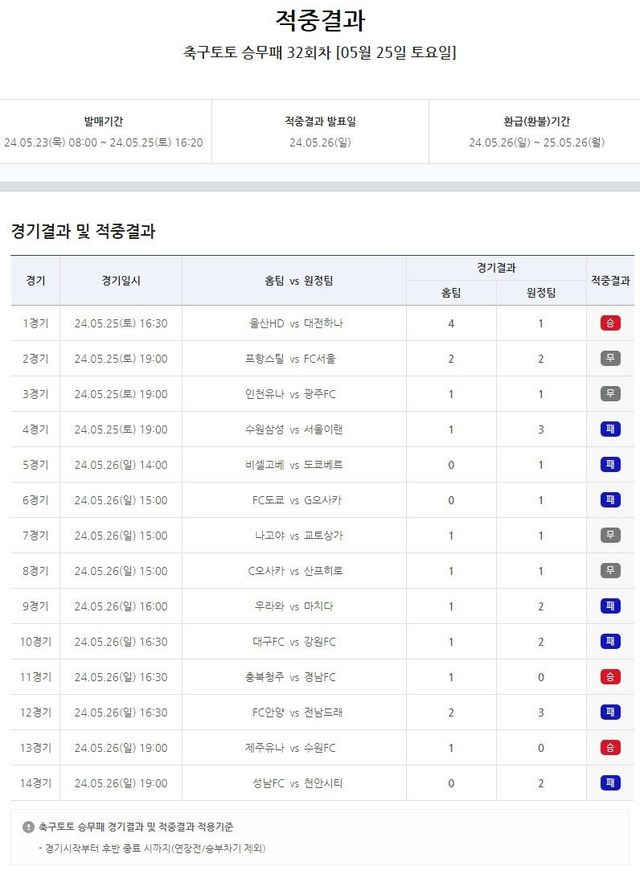 축구토토 승무패 32회차 14개 대상경기 결과 중 승(홈팀 승리)은 3건으로 가장 적었다. 반면 무(양 팀 무승부)는 4건, 패(홈팀 패배)는 7건이었다.