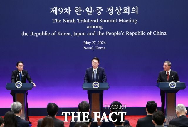 윤 대통령은 이날 청와대 영빈관에서 기시다 총리, 리 총리와 제9차 한일중 정상회의를 가진 후 공동 기자회견을 했다. 이번 한일중 정상회의는 2019년 12월 제8차 회의 이후 약 4년 5개월 만에 열린 것으로, 경색 국면이었던 3국 협력의 복원과 정상화 계기를 마련했다는 평가가 나온다.