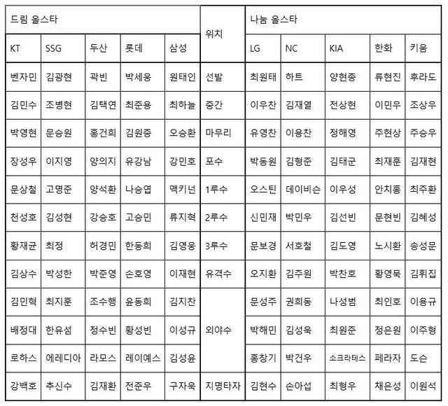 명단은 해당 구단에서 추천한 포지션별 1명씩(투수는 선발, 중간, 마무리 각각 1명씩 총 3명)의 선수로 구성돼 구단 당 12명, 총 120명의 선수가 후보에 올랐다.