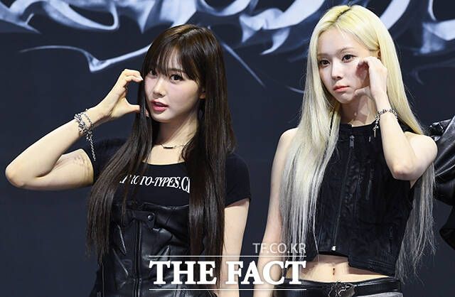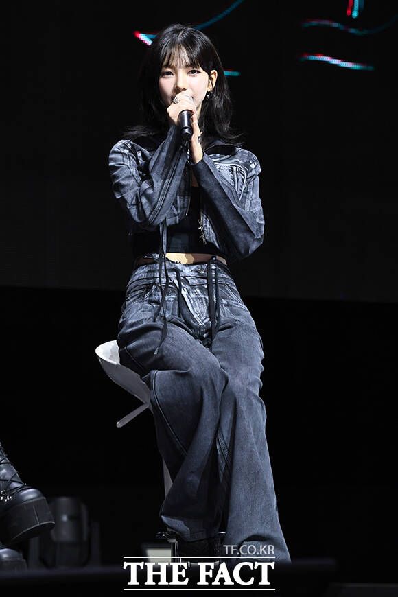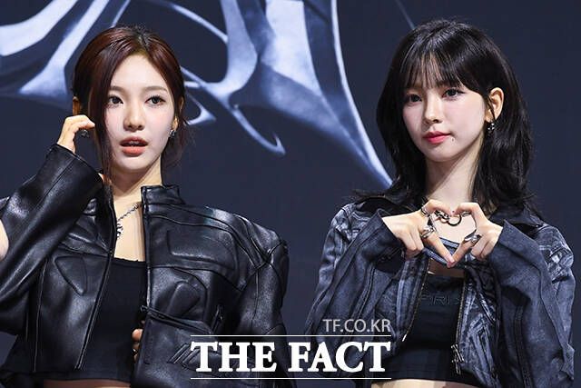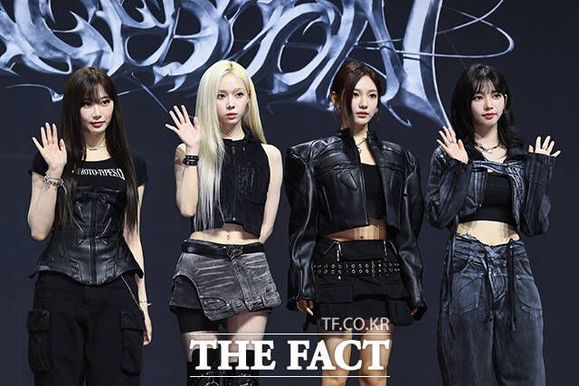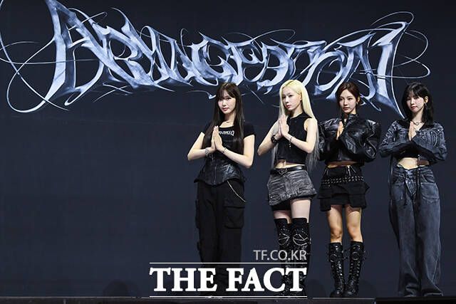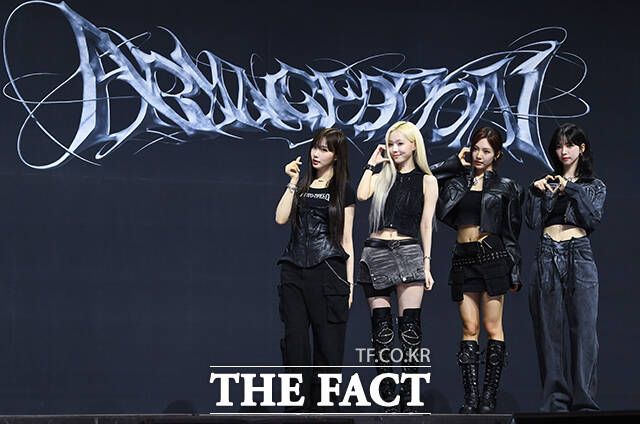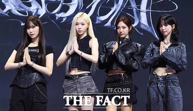 [더팩트ㅣ서예원 기자] 그룹 에스파의 지젤과 윈터, 닝닝, 카리나(왼쪽부터)가 27일 오후 서울 용산구 블루스퀘어 마스터카드홀에서 열린 첫 정규 앨범 'Armageddon(아마겟돈)' 발매 기념 쇼케이스에서 포즈를 취하고 있다.