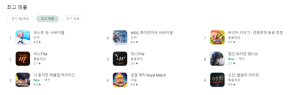 한편, 5월 4주차 장르별 구글플레이 매출 TOP10을 살펴보면 ‘라스트 워: 서바이벌’이 다시 선두를 차지한 가운데, MMORPG가 3종, 전략 게임과 수집형 RPG가 각각 2종, 방치형 RPG, 퍼즐, 액션이 각각 1종씩 자리했다.