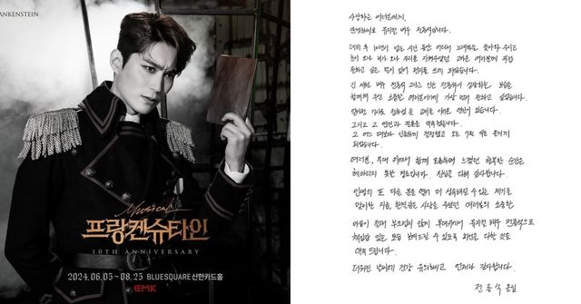 이어 "인생의 또 다른 문을 열어 더 성숙해질 수 있는 계기를 맞이한 지금 한결같은 사랑을 주셨던 여러분의 소중한 마음이 절대 부끄럽지 않게 무대 위에서 뮤지컬 배우 전동석으로 책임감 있는 모습 보여드릴 수 있도록 최선을 다하겠다"고 약속했다.
