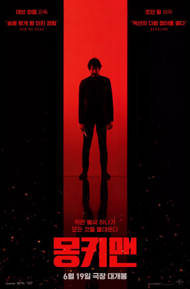 공개된 공식 포스터는 올블랙 수트를 입은 ‘키드’가 단검을 손에 든 채 정면을 노려보고 있어 보는 것만으로도 압도되는 느낌을 전한다. “작은 불씨 하나가 모든 것을 태운다”라는 포스터 속 문구만큼이나 블랙과 레드 색상의 강렬한 색 조합은 관객들의 시선을 단숨에 빼앗으며 ‘키드’의 목숨을 건 복수와, 그가 스스로 복수의 신 ‘몽키맨’으로 거듭난 과정에 대한 궁금증을 불러일으킨다.