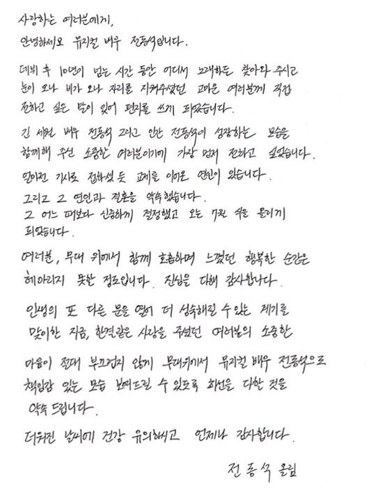 데뷔 후 10년이 넘는 시간 동안 어디서 노래하든 찾아와 주시고 눈이 오나 비가 오나 자리를 지켜주셨던 고마운 여러분께 직접 전하고 싶은 말이 있어 편지를 쓰게 되었습니다.