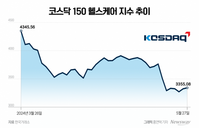 27일 한국거래소에 따르면 알테오젠, HLB, 셀트리온제약 등 코스닥 시장 주요 바이오·헬스케어 종목들로 구성된 코스닥 150 헬스케어 지수는 지난 16일 3770.84에서 이날 3355.08로 11.0% 하락했다. 지난 23일 3285.61로 저점을 기록한 것과 비교하면 소폭 반등했지만, 여전히 HLB 사태 이전 수준으로 회복하진 못하고 있다. 코스피·코스닥 시장 전체의 바이오 종목 75개를 묶은 KRX헬스케어 지수도 이 기간 8.1% 줄었다.