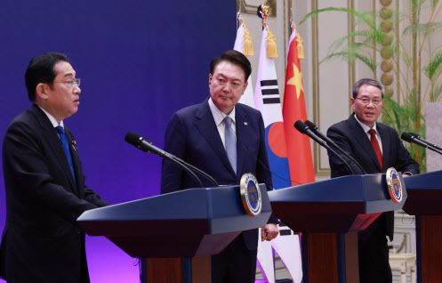 27일 한일중 3국 9차 정상회담 직후 청와대 영빈관에서 진행한 공동기자회견에서 윤석열 대통령과 기시다 후미오 일본 총리는 북한의 완전한 비핵화를 강조한 반면, 리창 중국 국무원 총리는 한반도 평화를 위해 노력하겠다는 기존의 입장을 유지했다.