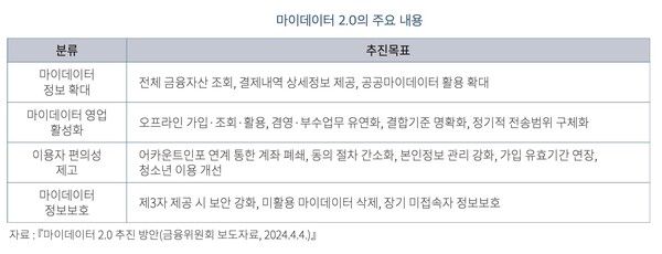금융 당국은 지난 4월 마이데이터 2.0 시대를 열겠다며 추진 방안을 발표한 바 있다. 생태계 전반을 키우고, 사용자 편의를 증대시키는 한편, 보안은 강화하겠다는 방침이다. 이에 '마이데이터 2.0 시대'는 지금과 온도차가 있을지 기대되고 있다.