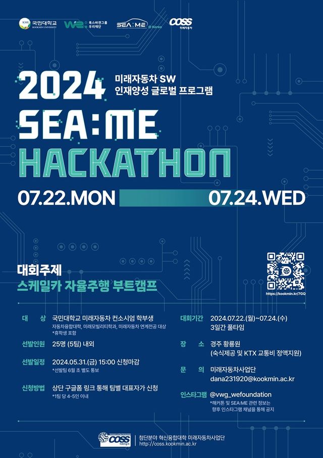 2024 SEA:ME 해커톤은 폭스바겐그룹 우리재단이 후원하고, 교육부가 추진하는 첨단분야 혁신융합대학(Convergence and Open Sharing System, 이하 COSS) 미래자동차 컨소시엄이 주관하고, 지능형로봇 컨소시엄이 참여하는 자율주행 모빌리티 개발 공모전이다.