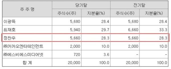 2018년 설립된 생각엔터테인먼트(이하 생각엔터) 감사보고서에 따르면, 2023년 12월 기준 이곳의 지분은 이광득 대표(28.4%), 최재호 이사(29.7%), 개그맨 정찬우(28.3%) 등 3인이 거의 동일한 비율로 소유하고 있다. 여기에 카카오엔터테인먼트(10.0%), SBS미디어넷(3.6%)으로 구성돼 있다.