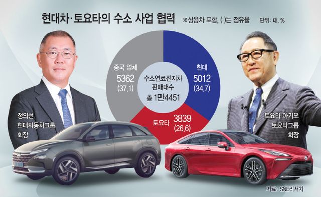 27일 SNE리서치에 따르면 현대차와 토요타는 지난해 각각 5012대와 3839대의 수소차(상용차 포함)를 판매한 것으로 집계됐다. 시장 점유율로 따져보면 양사는 각각 34.7%, 26.6%로, 전체 수소 완성차 시장에서 양사 비중이 과반을 차지했다.