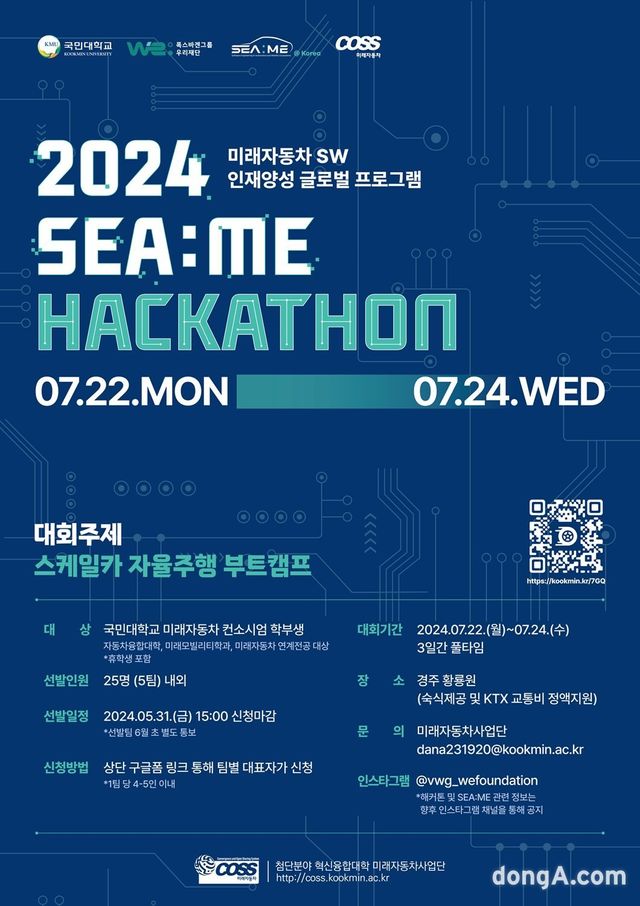 2024 씨: 해커톤은 폭스바겐그룹 우리재단이 후원하고, 교육부가 추진하는 첨단분야 혁신융합대학(COSS) 미래자동차 컨소시엄이 주관한다. 지능형로봇 컨소시엄이 참여하는 자율주행 모빌리티 개발 공모전이다.