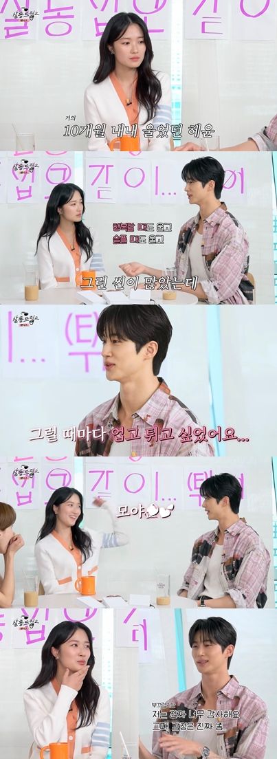 변우석은 "사실 거의 저희가 10개월, 11개월 촬영했는데 혜윤이가 거의 10개월을 매일 울었다"라며 "그렇게 감정을 줄 때마다 전 너무 (감정이) 잘 느껴졌다. (혜윤이가) 행복할 때도 울고, 슬플 때도 울고 (그런 씬이) 많았다. 그럴 때마다 업고 튀고 싶었다"라고 밝혔다.