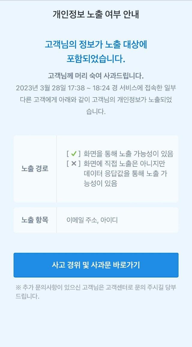 어플 들어가면 개인정보 유출됐는지 확인하라고 알림 뜸