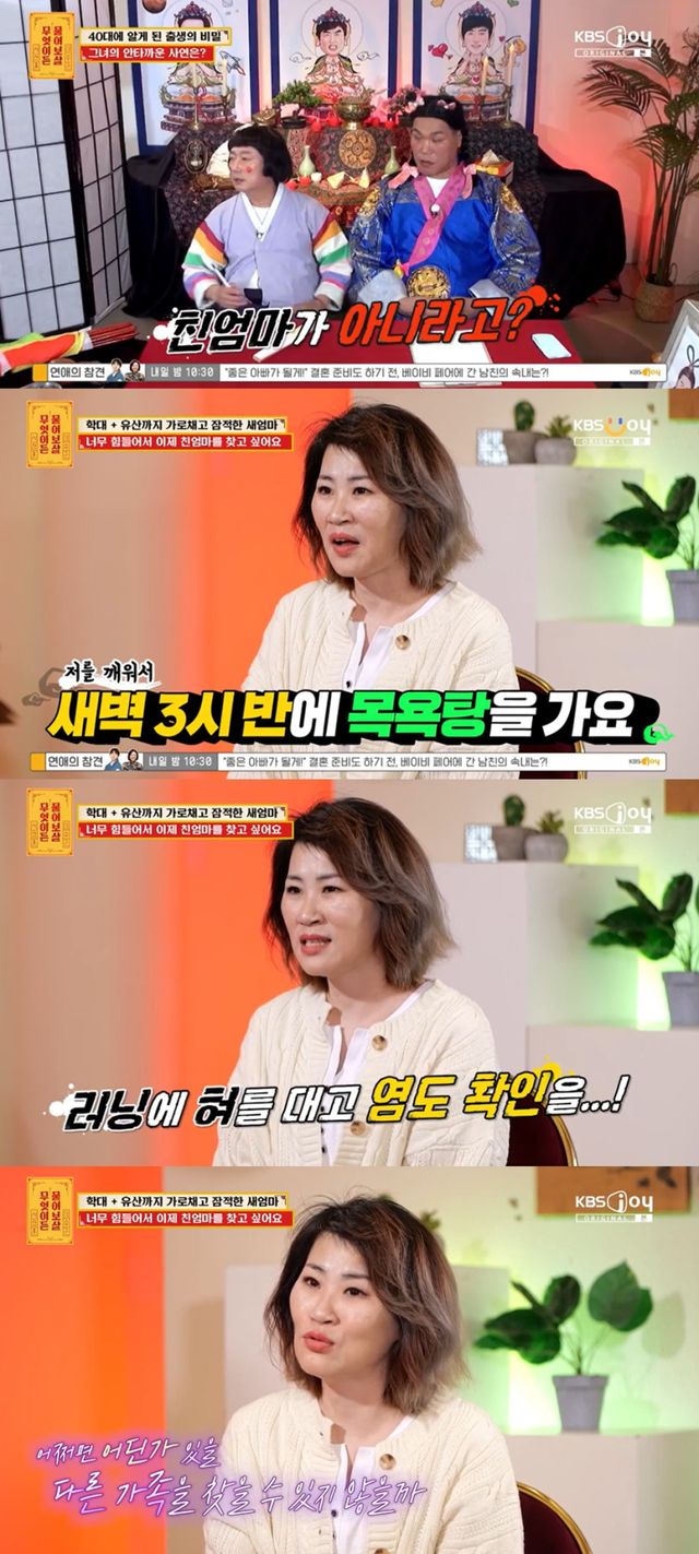 이수근이 어떤 학대를 당한 것인지 묻자 사연자는 “새어머니가 결벽증이 심했다. 새벽 3시반에 목욕탕을 가야 한다. 첫 손님으로 가야 했다. 기본 목욕 시간이 6시간이었다. 집에 오면 거의 12시가 넘었다”고 말했다.