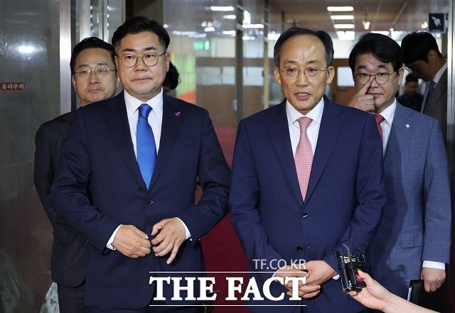 추경호(오른쪽) 국민의힘 원내대표와 박찬대 더불어민주당 원내대표가 27일 오전 서울 여의도 국회 의장실에서 김진표 국회의장 주재 여야 원내대표 회동을 마치고 나와 회동 결과를 말하고 있다. /뉴시스