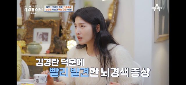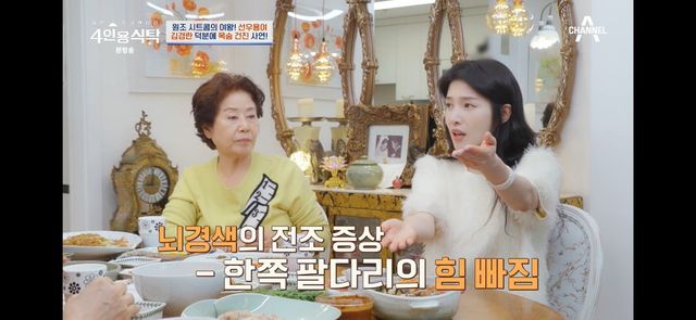 [TV리포트=이지민 기자] ‘4인용식탁’ 선우용녀(78)의 뇌경색 증상을 김경란(46)이 가장 먼저 알아차렸다고 전했다. 선우용녀는 큰일날 뻔한 상황이었지만, 다행히 김경란 덕에 안전하게 병원에 갈 수 있었다.