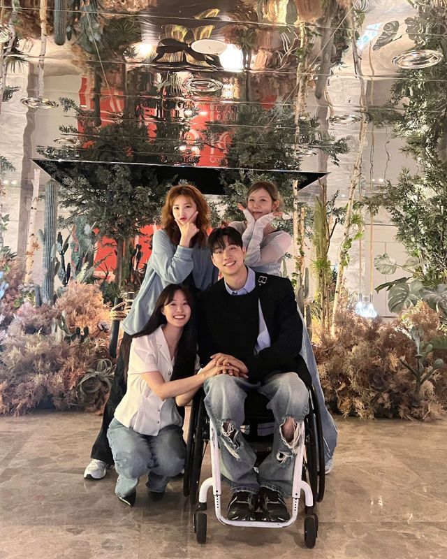 공개된 사진 속 박위는 예비신부 송지은을 비롯해 전효성, 정하나와 함께 포즈를 취하고 있다.