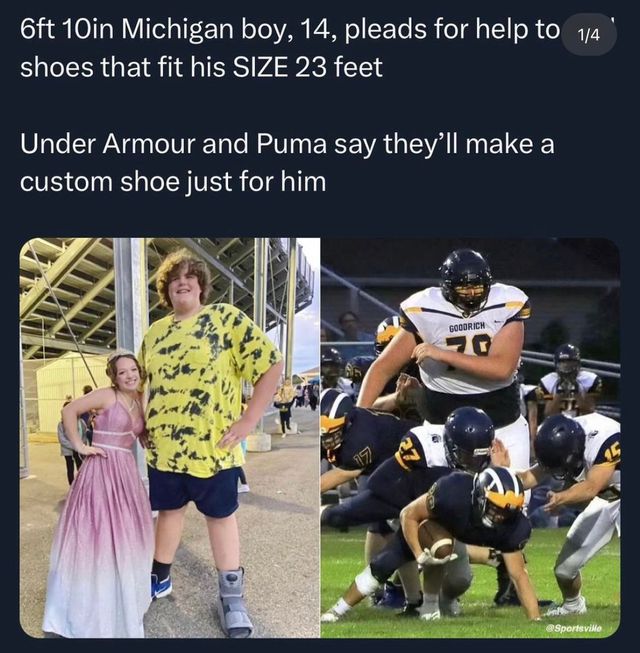 6피트 10인치(208cm) 미시간 소년, 14세는 23피트(410) 사이즈에 맞는 신발을 찾고있다.