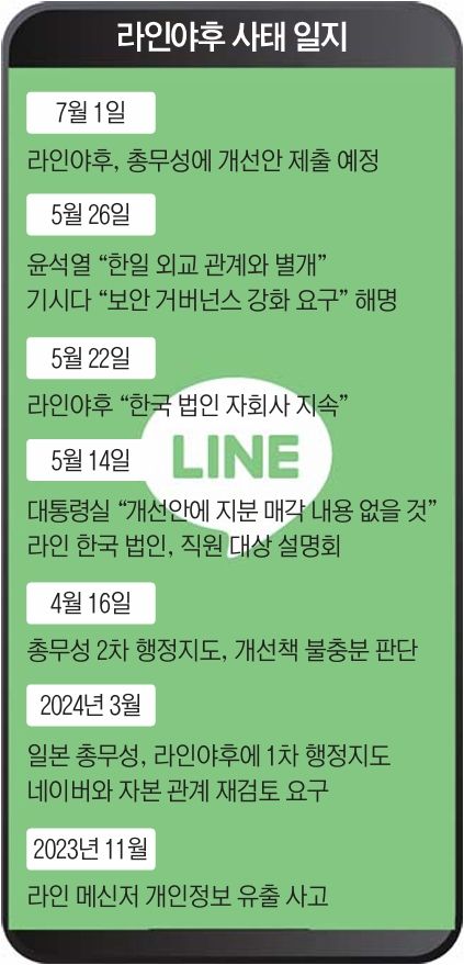 총무성이 라인야후에 제시한 개선안 제출 기한인 오는 7월 1일을 앞두고 대통령실이 "지분 매각 내용은 포함되지 않을 것"이라는 발언을 해 사태가 잠잠해지는 듯했다.