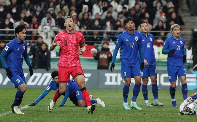 2024년 3월 21일 오후 서울 마포구 서울월드컵경기장에서 열린 2026 북중미 월드컵 아시아지역 2차 예선 C조 조별리그 3차전 대한민국과 태국의 경기에서 조규성이 슛이 막히자 아쉬워하고 있다. / 뉴스1