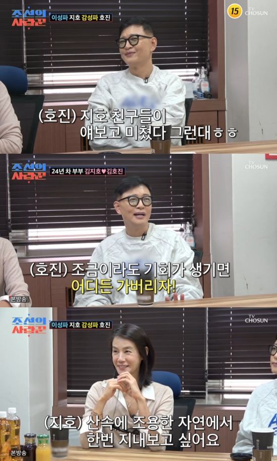 김지호는 "사실은 누구랑 같이 뭘 하는 것보다 남편이랑 뭘 하는 게 제일 편하다"라며 자랑했고, 김호진은 "그래서 지호 친구들이 얘한테 미쳤다 그런다더라"라며 너스레를 떨었다. 김지호는 "'너네 다시 신혼이야?' 막 이러는데 그런 거 아니고 이제 진짜 둘인 게 제일 편한 거다"라며 애정을 과시했다.