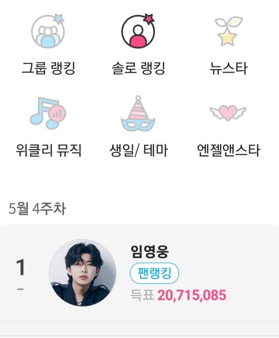 최근 '팬앤스타'에 따르면, 임영웅은 5월 4주 차 솔로가수 인기 랭킹 투표에서 1위에 등극했다.
