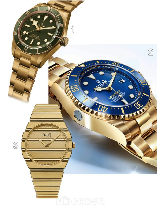케이스와 브레이슬릿이 모두 골드로 이루어진, 시쳇말로 ‘통 골드’라 부르는 묵직한 시계가 자주 목격됐다. 럭셔리 스포츠 워치가 각광받으면서, 스포티한 무드는 살리고 고급스러움은 한껏 드러낼 수 있는 스타일에 대한 니즈가 반영된 것으로 보인다. 롤렉스는 ‘오이스터 퍼페츄얼 롤렉스 딥씨’에 처음으로 18K 옐로 골드 소재를 적용했다. 수심 3900m 방수가 가능한 지름 44mm, 두께 17.7mm의 볼드한 옐로 골드 케이스에 풀림 방지 및 글라이드록 익스텐션 시스템을 적용한 18K 옐로 골드 소재 오이스터 3열 브레이슬릿을 장착해 손목에 착용했을 때 상당한 무게감이 느껴진다. 튜더도 아이코닉한 다이버 워치 ‘블랙 베이 58’을 18K 옐로 골드 소재로 재해석했다. 새틴 브러시된 옐로 골드 케이스와 브레이슬릿이 톤다운된 그린 다이얼 및 베젤과 어우러져, 한층 럭셔리한 무드를 전한다. 피아제는 창립 150주년을 맞아 전체가 18K 골드 소재로 이루진 상징적인 스포츠 시계 ‘피아제 폴로’를 복각했다. 38mm 케이스로 새롭게 탄생한 ‘피아제 폴로 79’는 울트라-씬 셀프와인딩 칼리버 1200P1으로 구동한다. 그 밖에도 럭셔리 스포츠 워치를 대표하는 모델인 위블로 ‘빅뱅’, 바쉐론 콘스탄틴 ‘오버시즈’, 오데마 피게 ‘로열오크’ 컬렉션의 ‘통 골드’ 버전 신작도 만날 수 있었다.