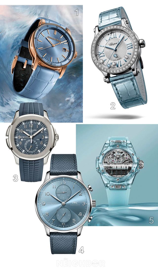 올해 워치 신에서 가장 눈에 띄는 컬러를 꼽는다면, 단연 라이트 블루가 아닐까. 꾸준히 인기를 얻고 있는 블루 다이얼 워치와는 또 다른, 싱그럽고 부드러운 무드가 시선을 사로잡는다. 위블로는 독보적인 사파이어 컬러 팔레트에 ‘워터 블루’ 컬러를 추가했다. 14일 파워리저브 기능의 무브먼트 HUB9011을 탑재한 ‘MP-11 워터 블루 사파이어’ 워치는 폴리싱 처리한 지름 45mm 사파이어 크리스털 케이스에 워터 블루 컬러의 러버 스트랩을 매치해 청량감을 더했다. IWC의 올해 주력 모델인 ‘포르투기저’는 낮과 밤의 무한한 주기에서 영감을 얻은 새로운 컬러 코드로 단장했다. 그중 호라이즌 블루 다이얼은 18K 화이트 골드 케이스에 블루 카프스킨 스트랩을 결합해 화창한 푸른 하늘을 연상시킨다. 쇼파드는 인덱스 컬러와 핸즈, 무빙 스톤, 스트랩에 하늘색 악센트를 더한 ‘해피 스포츠’ 워치를, 파텍필립은 라이트 데님 블루 컬러의 ‘아쿠아넛 트래블 타임’을 선보여 트렌드에 동참했다. 오데마 피게의 ‘코드 11.59’ 워치에서 볼 수 있듯 핑크 골드와 라이트 블루 컬러의 조화도 매력적이다.