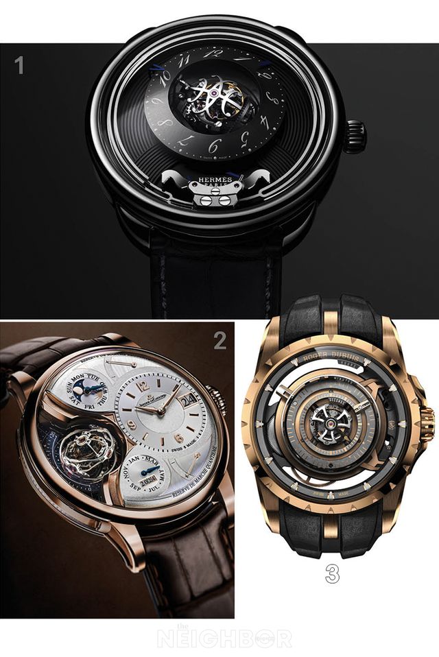 1 에르메스 아쏘 아뜰레. 2 예거 르쿨트르 듀오미터 헬리오 투르비용 퍼페추얼. 3 로저드뷔 오르비스 인 마키나.