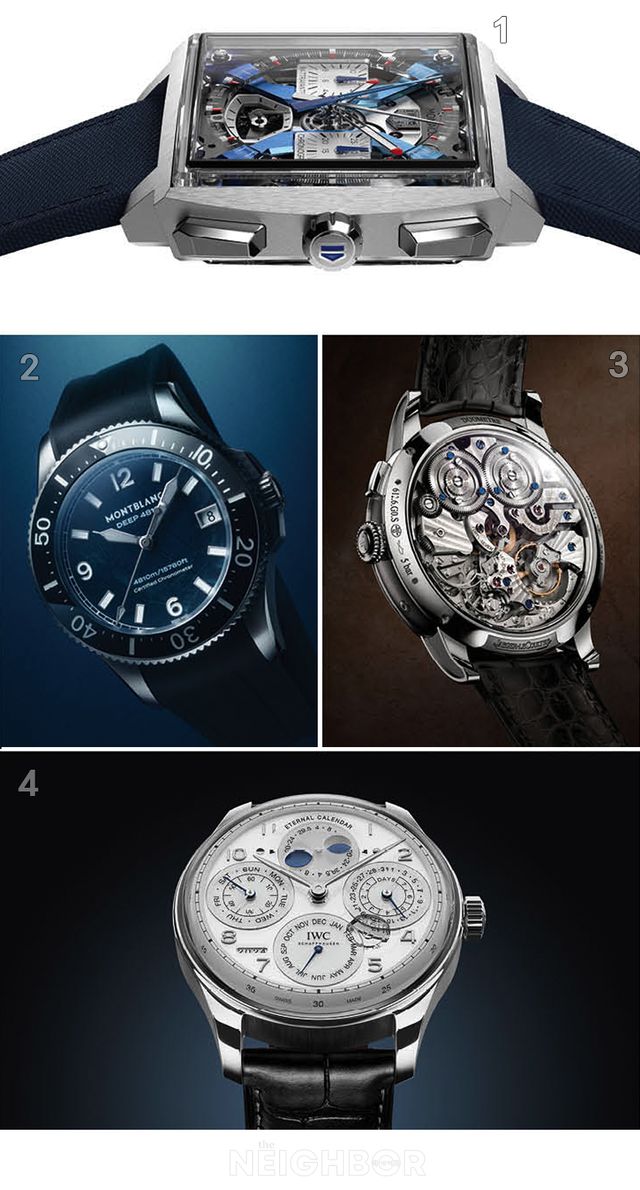 1 태그호이어 모나코 스플릿 세컨드 크로노그래프. 2 몽블랑 아이스드 씨 제로 옥시전 딥 4810. 3 예거 르쿨트르 듀오미터 크로노그래프 문 뒷모습. 4 IWC 포르투기저 이터널 캘린더.