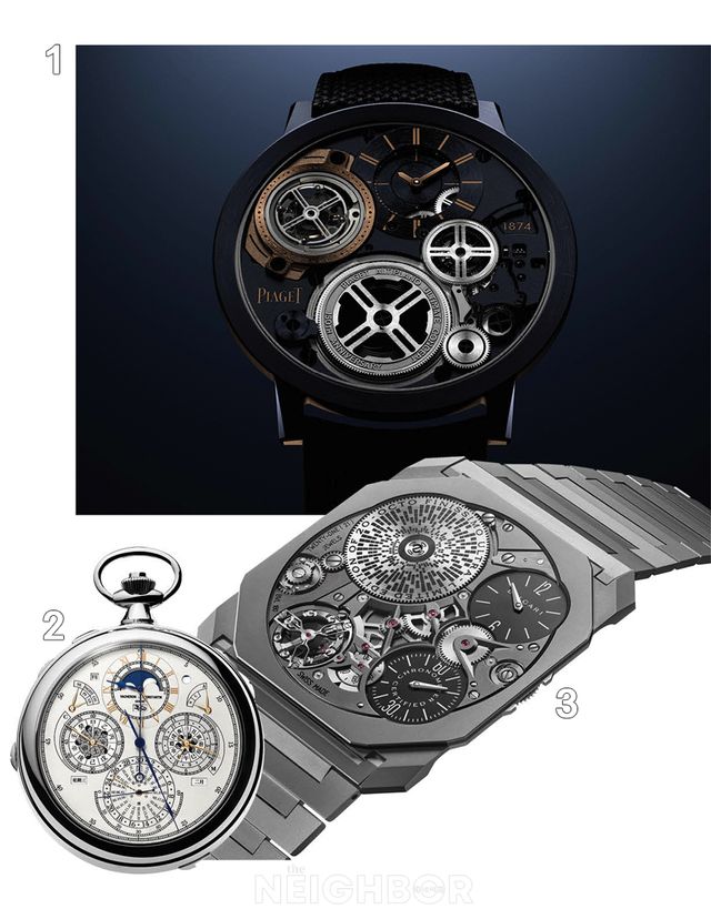 1 피아제 알티플라노 울티메이트 컨셉 투르비용. 2 바쉐론 콘스탄틴 레 캐비노티에 더 버클리 그랜드 컴플리케이션. 3 불가리 옥토 피니씨모 울트라 COSC.