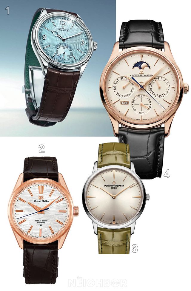 1 롤렉스 퍼페츄얼 1908. 2 그랜드 세이코 에볼루션 9. 3 바쉐론 콘스탄틴 패트리모니 매뉴얼 와인딩. 4 예거 르쿨트르 마스터 울트라 씬 퍼페추얼 캘린더.