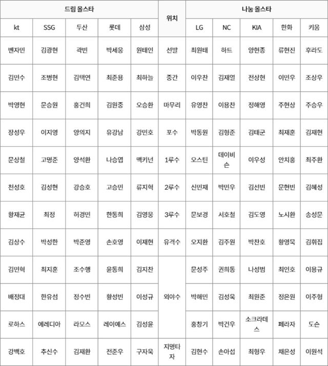 발표된 2024 KBO 올스타전 명단은 다음과 같다.