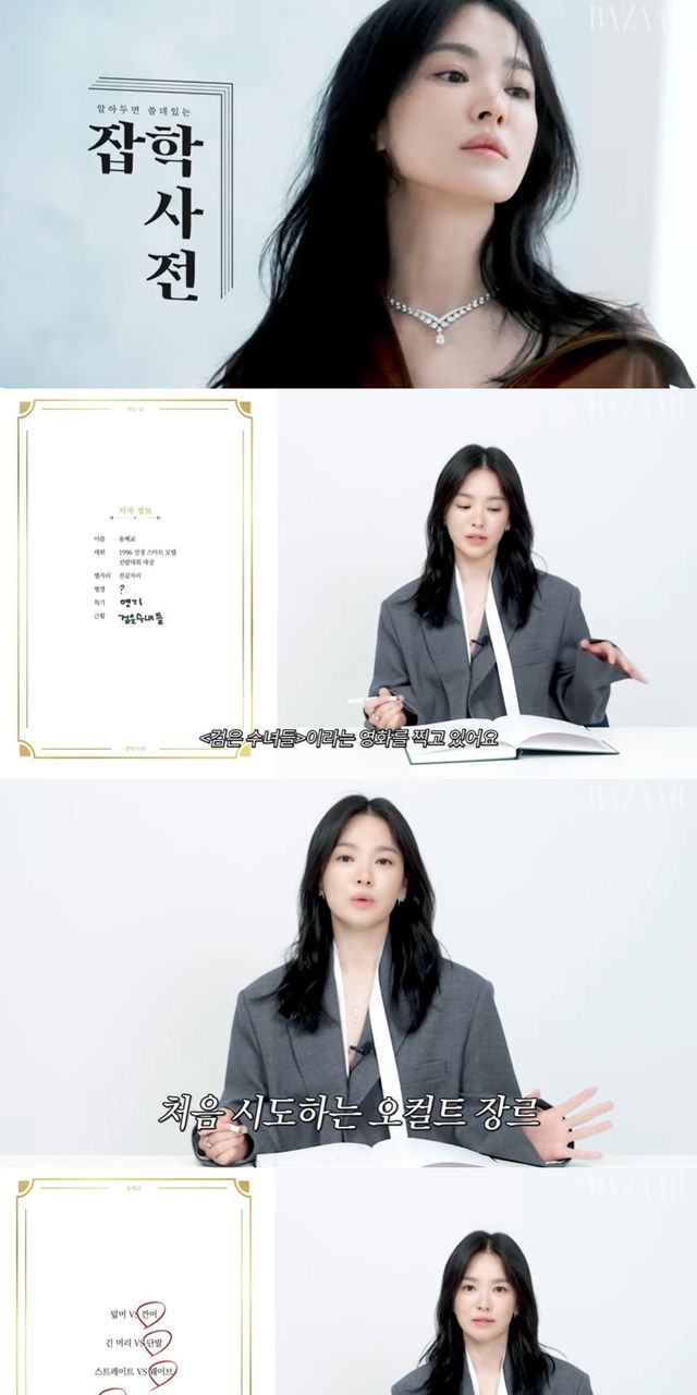 영상에서 송혜교는 '알아두면 쓸데있는 잡학사전' 인터뷰를 펼쳤다. 그는 1996년 선경 스마트 모델 선발대회 대상에서 입상한 것에 대해 "맞다"며 '대상'을 강조해 웃음을 안겼다.